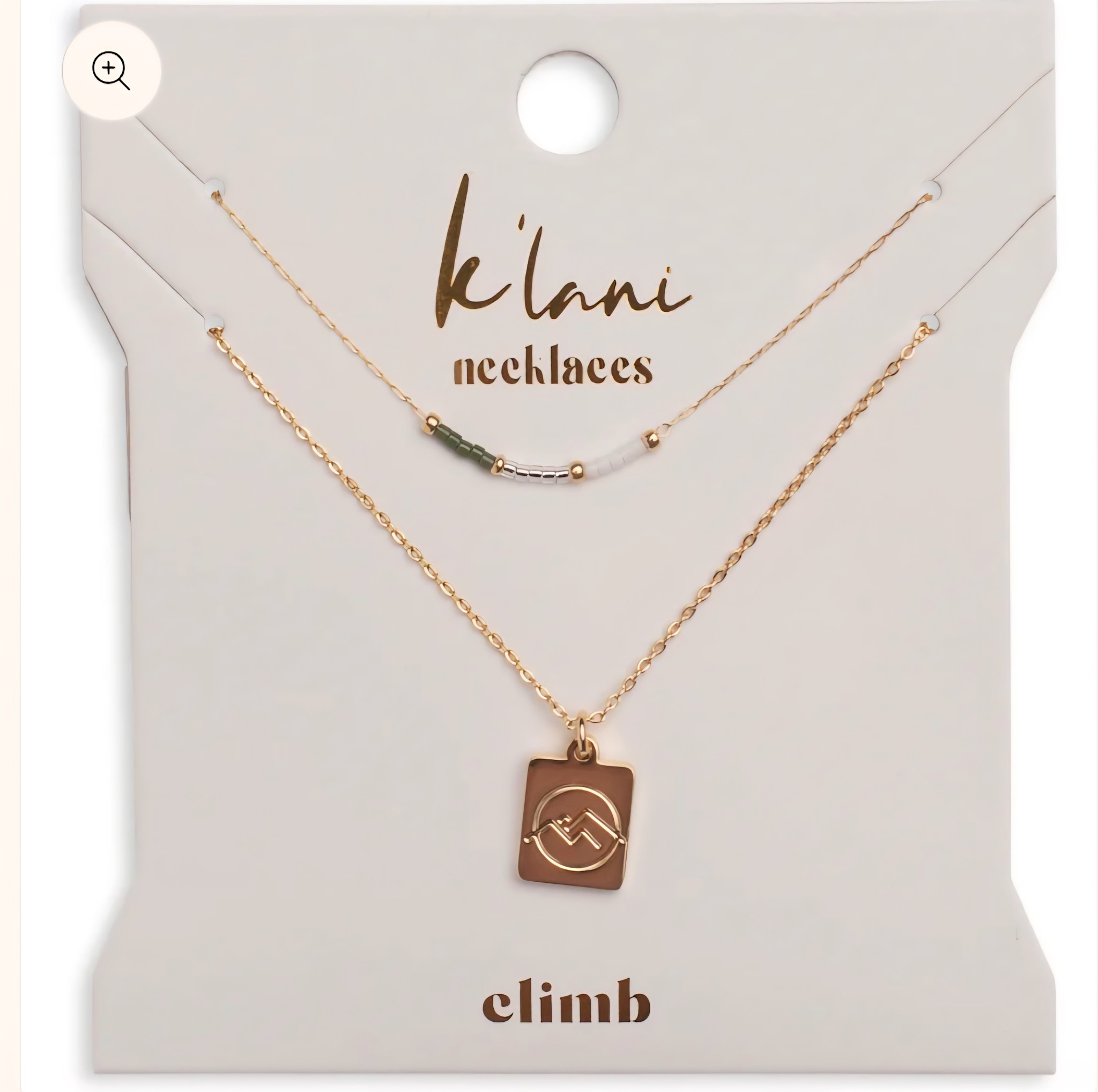 The Climb necklace set is two-piece set that includes dainty 18k gold-coated stainless steel chains—durable, water and sweat proof for everyday wear. The top necklace (adjustable 14–16 inches) is adorned with small woody green and cream beads, while the bottom necklace (adjustable 16–18 inches) features a mountain stamp on a rectangle charm, Wear them layered or separately as a symbol of strength, resilience, and the beauty of the journey