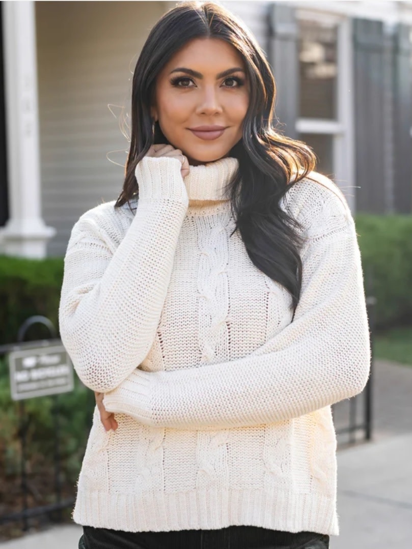 • new High Neck Cable Knit Sweater is a classic, timeless design we couldn’t wait to bring you this season, and trust us when we say you’ll be replacing that old scratchy sweater you have in you closet after you grab our version! Made with a soft sweater yarn with a touch of stretch running through, this cozy cable knit sweater features a wider turtleneck that sits comfortably away from the neck, a smooth, never-itchy texture, and is a quintessential fall and winter staple every wardrobe needs.