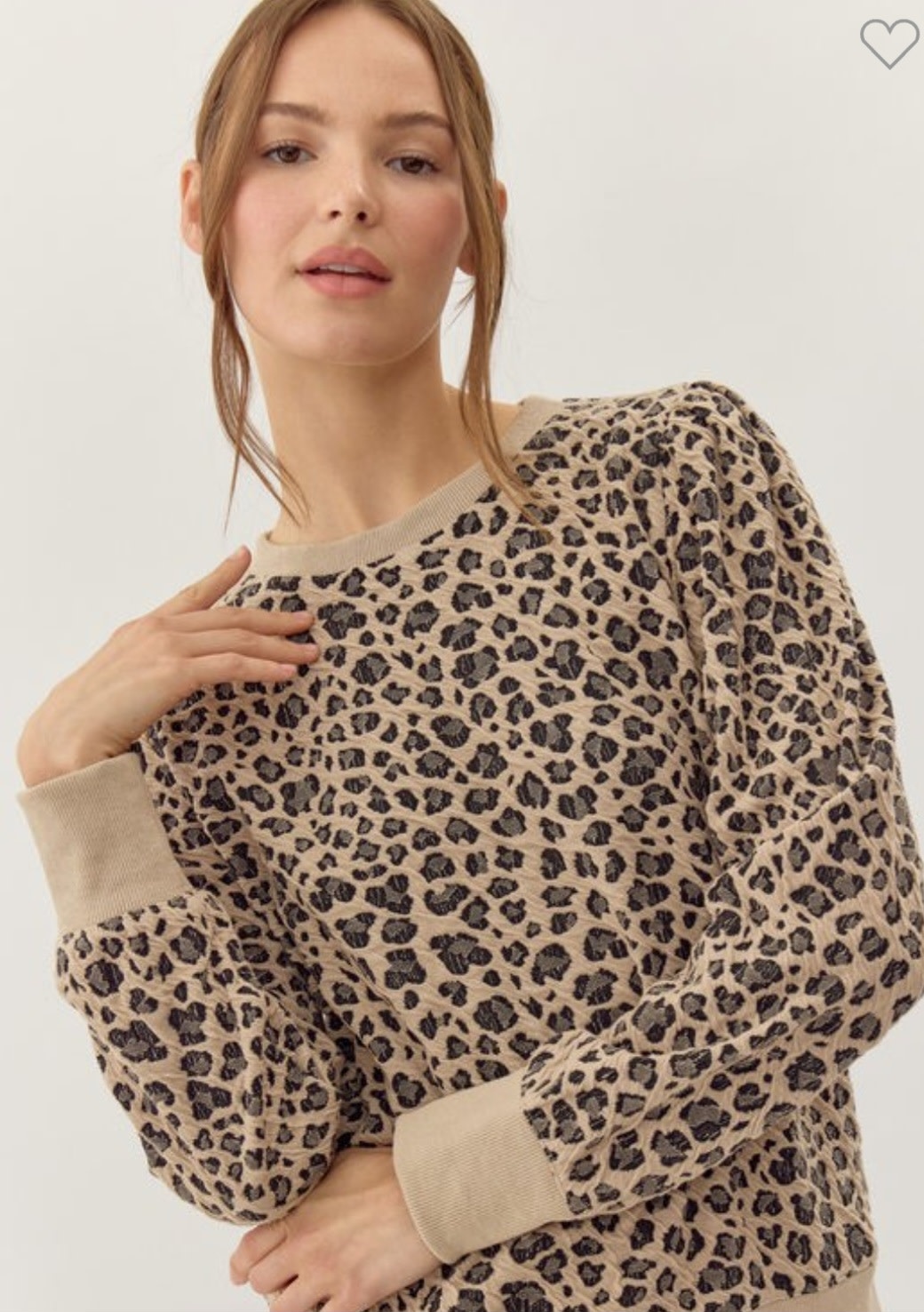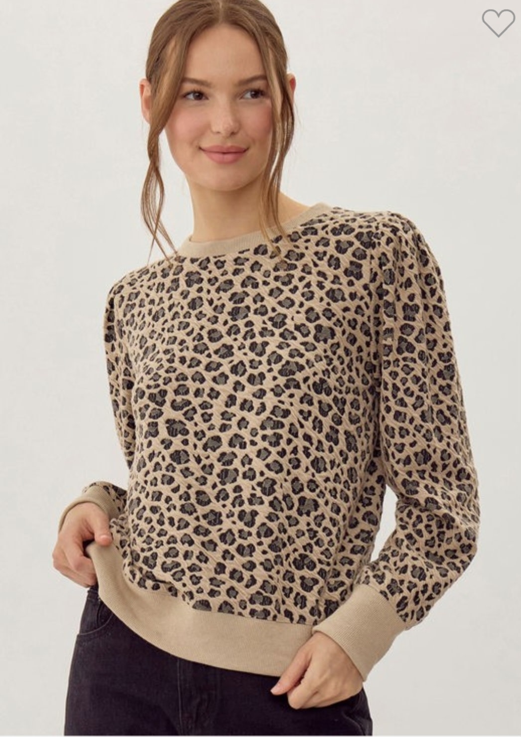 • Leopard Pullover Sweatshirt top with long puffed sleeves and ribbing at the sleeve ends and hemline. 97% Polyester, 3% Spandex