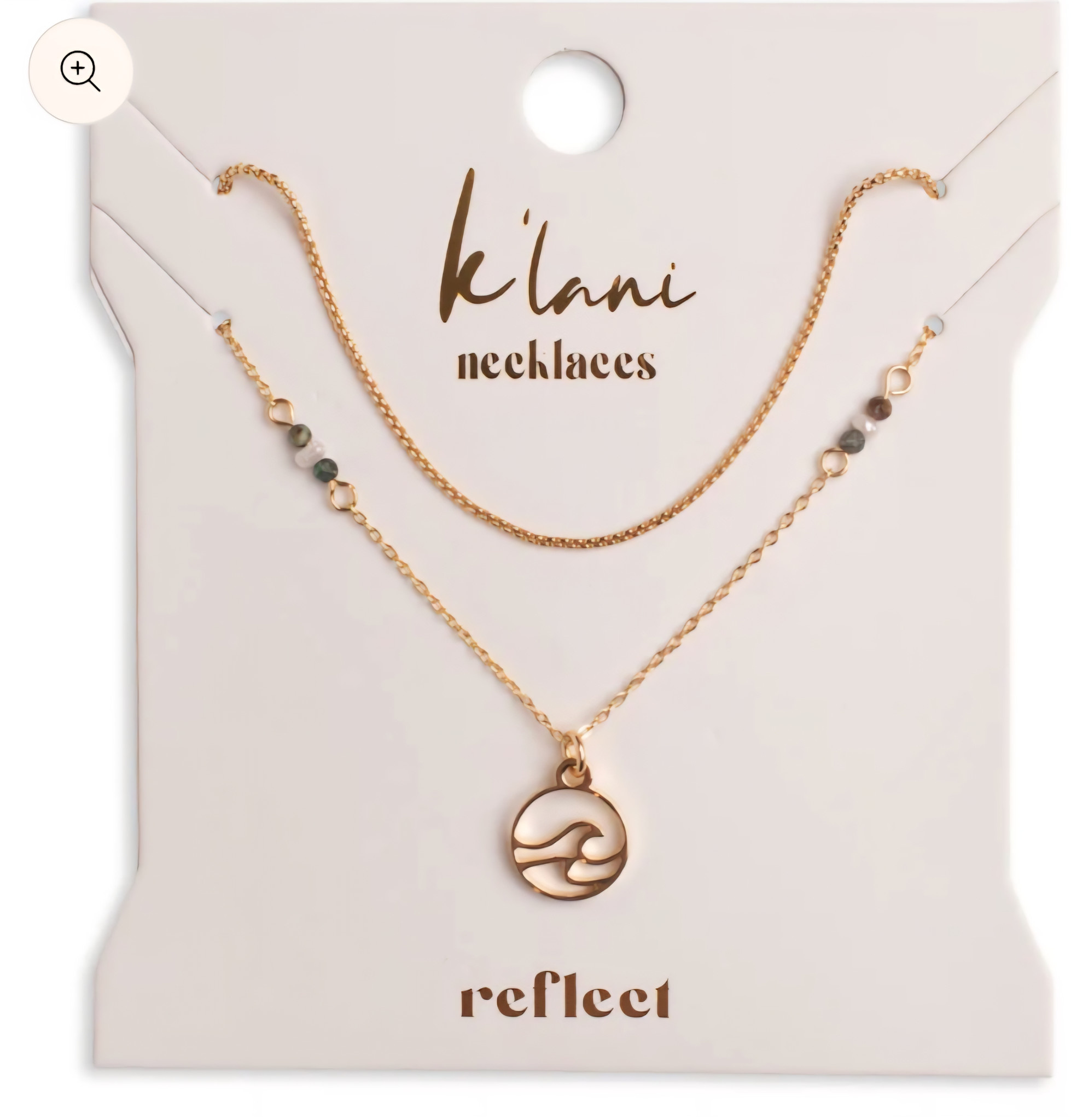 The Reflect necklace set is a calming symbol of inner peace and thoughtful intention. This two-piece set features dainty, water and sweat proof chains crafted from 18k gold-coated stainless steel for lasting wear. The top necklace (adjustable 14–16 inches) is a beautiful minimalist gold chain, while the bottom necklace (adjustable 16–18 inches) features a cut-out gold wave charm accented with natural stone beads and tiny pearls. A perfect reminder to slow down, breathe deep, and reflect on what truly matters.
